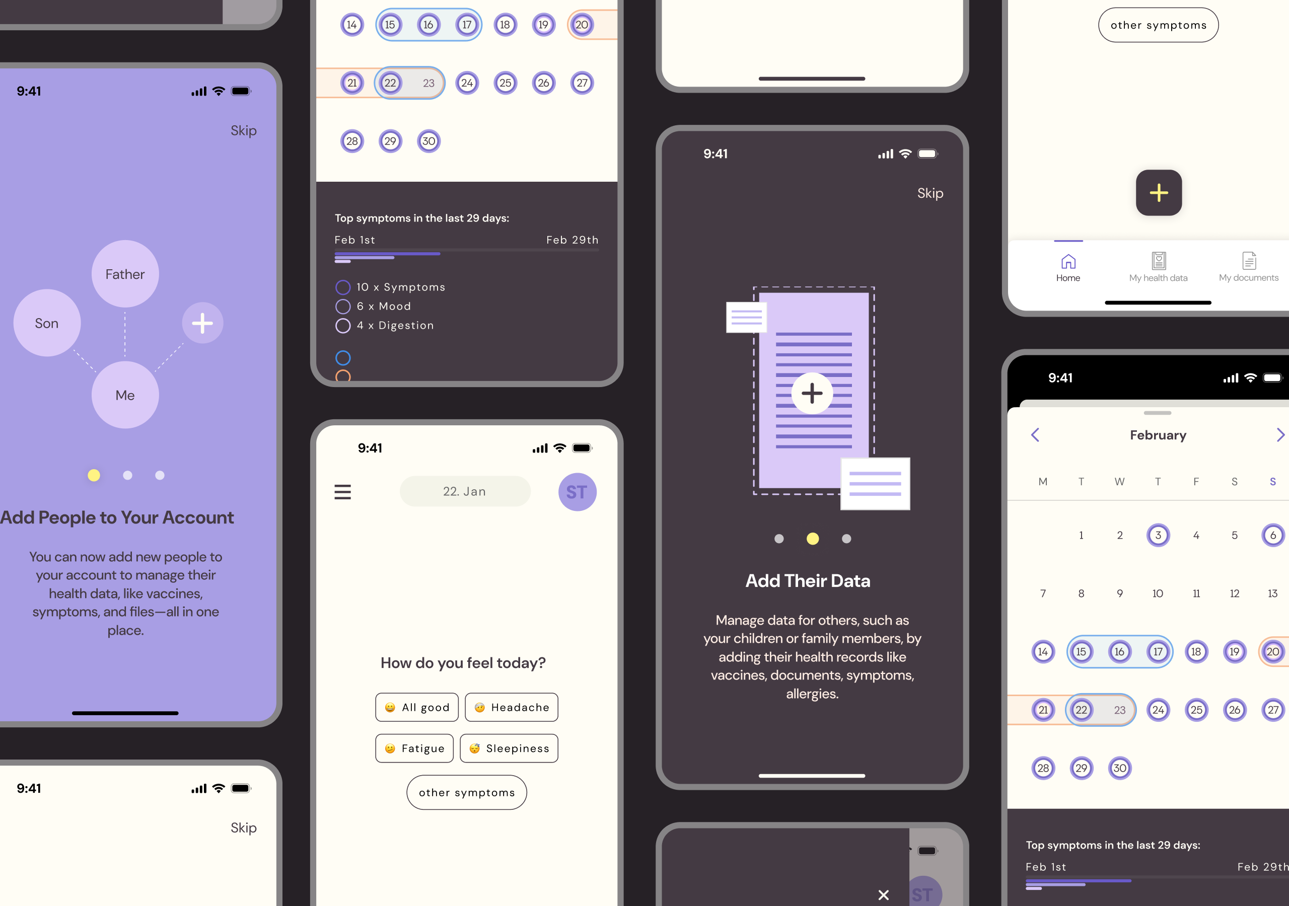 Joona® is a mobile application designed to help individuals and families securely track, organize, and store their health information. The app enables users to log symptoms, moods, vaccinations, ongoing conditions, and pregnancy details, while consolidating medical documents into a single, accessible platform. Privacy, independence, and user empowerment were central considerations in a highly regulated and sensitive sector.